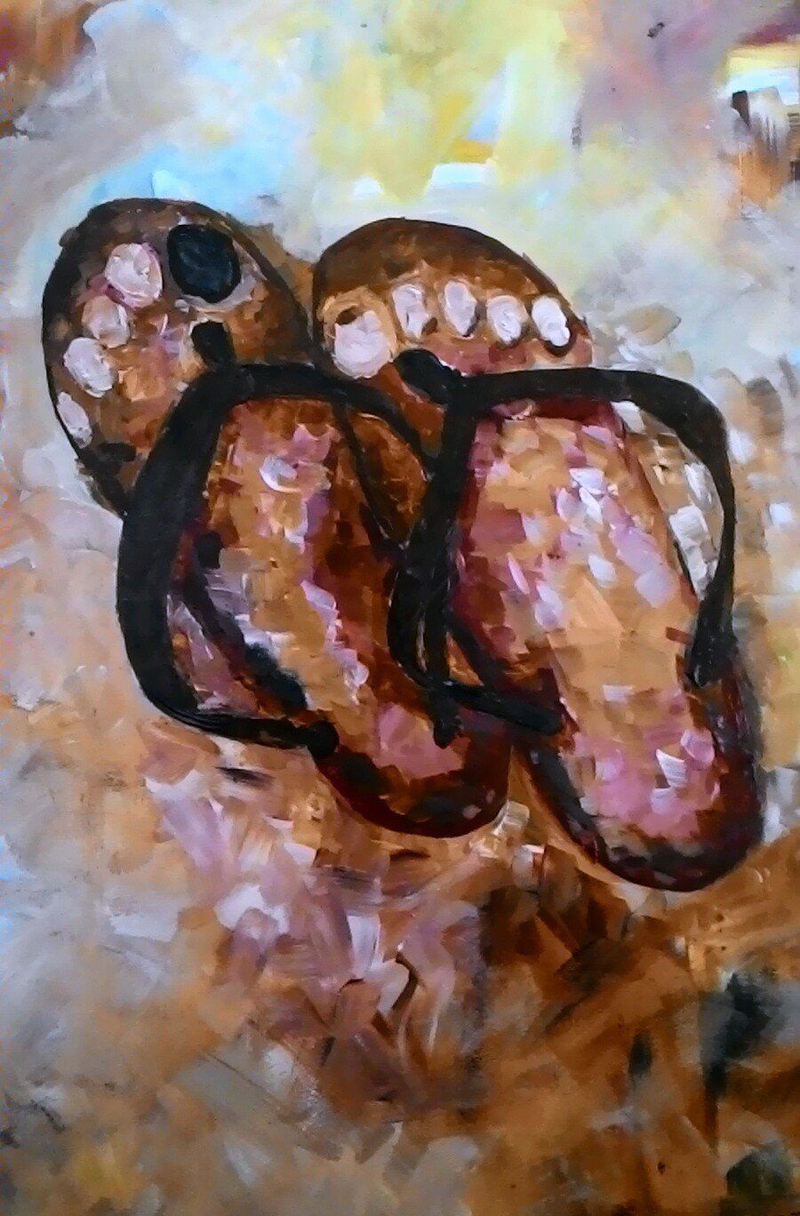 In 2012, photojournalist Shannon Jensen documented the displacement of South Sudanese from their homes through photos of their footwear, or lack of it. Later, the photos became an exhibit called A Long Walk, as part of the annual Moving Walls exhibit of the Open Society Foundations. Two of the paintings above were inspired by Shannon Jensen's photos. Some coverage of the exhibit can seen on PRI here.